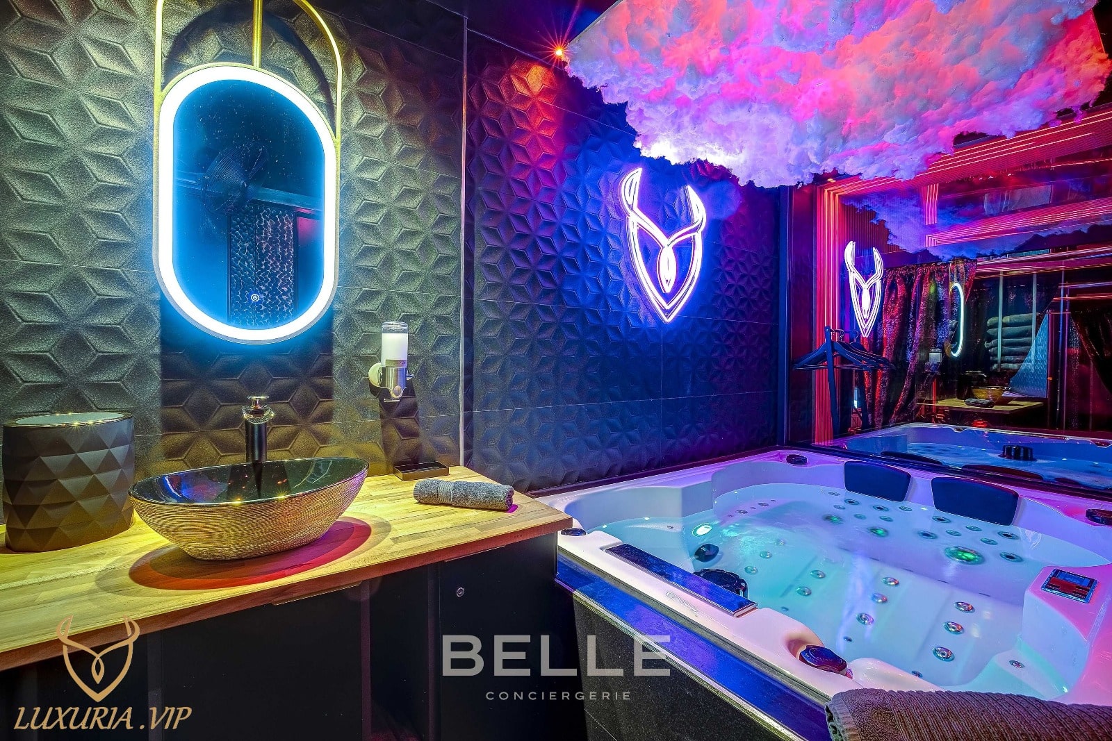 Cette suite haut de gamme propose un grand jacuzzi privatif, un hammam, une douche sensorielle, une ambiance lumineuse personnalisable et une décoration élégante pensée pour les couples. Parfait pour célébrer un anniversaire, une surprise romantique, une escapade détente ou une soirée spéciale, Luxuria offre une expérience unique alliant intimité, confort et prestations premium.